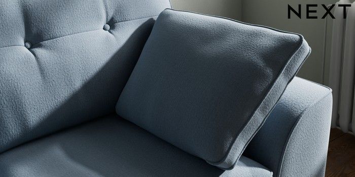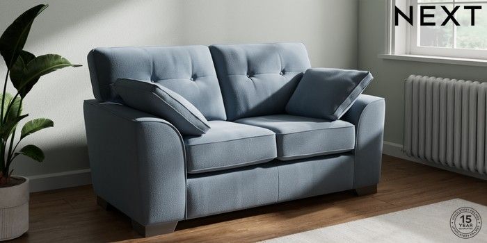 7.2.10 Buy Stamford Buttoned Back 2 Seater Small Sofa Relaxed Linen Look Mid Blue Large Square Angle - Gunmetal from the Next UK online shop Click here to use our accessible website