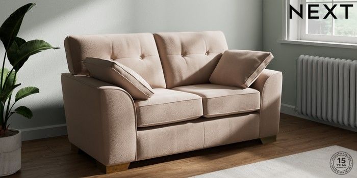 7.2.10 Buy Stamford Buttoned Back 2 Seater Small Sofa Relaxed Linen Look Mid Natural Large Square Angle - Brushed Brass from the Next UK online shop Click here to use our accessible website