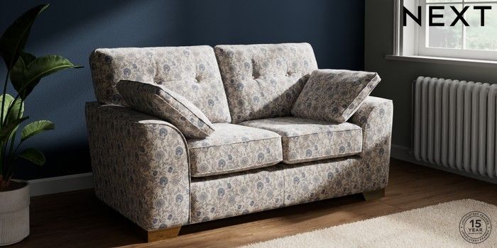 7.3.1 Buy Stamford Buttoned Back 2 Seater Small Sofa Relaxed Linen Look Print Woodblock Floral Blue Large Square Angle - Brushed Brass from the Next UK online shop Click here to use our accessible website
