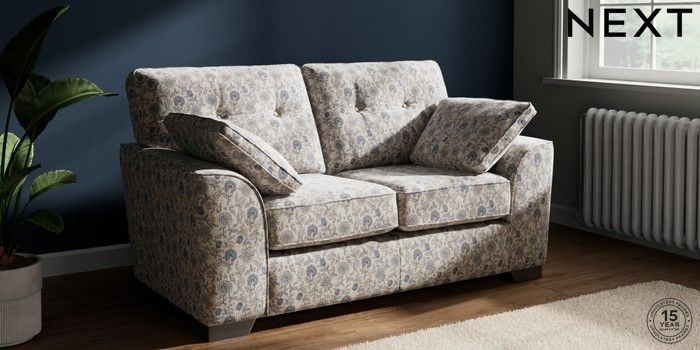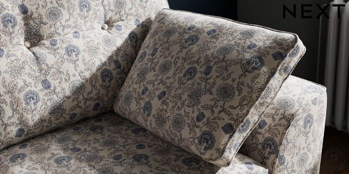 7.3.1 Buy Stamford Buttoned Back 2 Seater Small Sofa Relaxed Linen Look Print Woodblock Floral Blue Large Square Angle - Gunmetal from the Next UK online shop Click here to use our accessible website