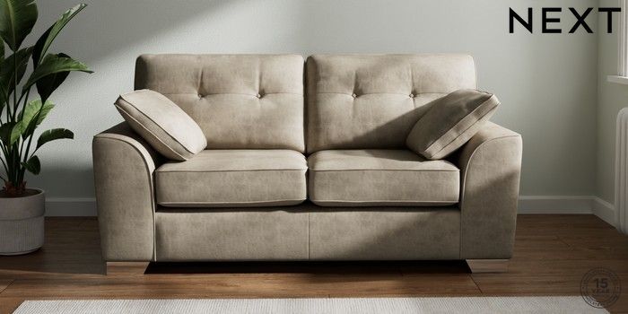 7.2.6 Buy Stamford Buttoned Back 2 Seater Sofa Monza Faux Leather Easy Clean Mink Brown Large Square Angle - Chrome Metal from the Next UK online shop Click here to use our accessible website
