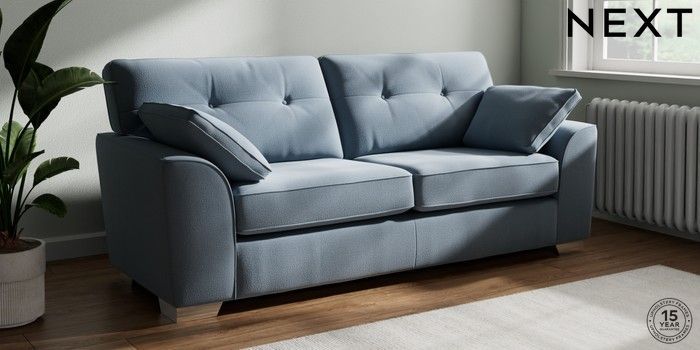 7.2.10 Buy Stamford Buttoned Back 3 Seater Sofa Relaxed Linen Look Mid Blue Large Square Angle - Chrome Metal from the Next UK online shop Click here to use our accessible website