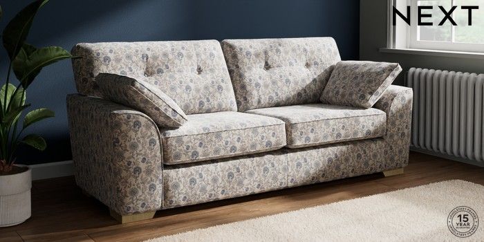 7.3.1 Buy Stamford Buttoned Back 3 Seater Sofa Relaxed Linen Look Print Woodblock Floral Blue Large Square Angle - Light from the Next UK online shop Click here to use our accessible website
