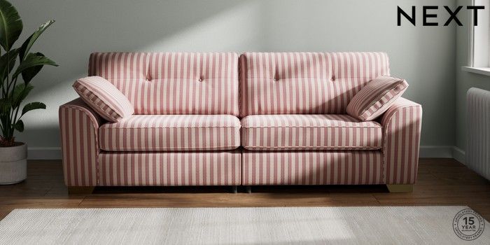 7.3.1 Buy Stamford Buttoned Back 4 Seater Sofa Bold Chenille Stripe Dark Pink Large Square Angle - Brushed Brass from the Next UK online shop Click here to use our accessible website