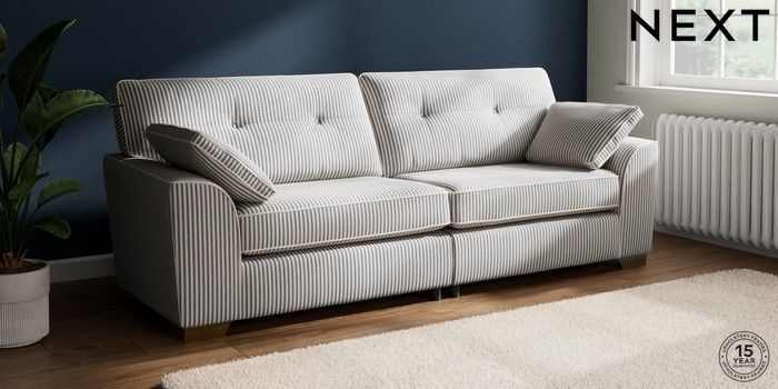 7.3.1 Buy Stamford Buttoned Back 4 Seater Sofa Chenille Stripe Slate Blue Large Square Angle - Brushed Brass from the Next UK online shop Click here to use our accessible website