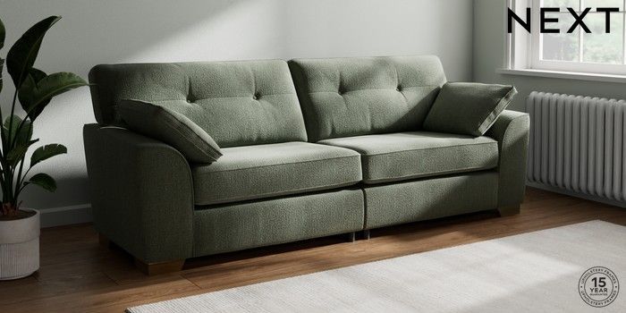 7.2.10 Buy Stamford Buttoned Back 4 Seater Sofa Chunky Texture Mid Forest Green Large Square Angle - Brushed Brass from the Next UK online shop Click here to use our accessible website