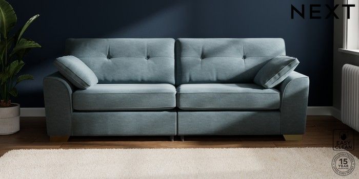 6.12.1 Buy Stamford Buttoned Back 4 Seater Sofa Fine Chenille Easy Clean Mid Blue Large Square Angle - Brushed Brass from the Next UK online shop Click here to use our accessible website