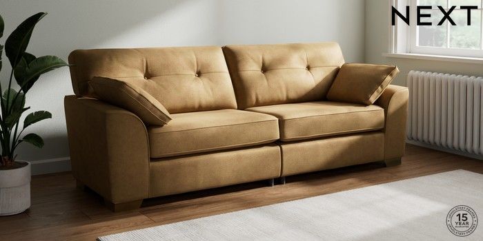 7.2.6 Buy Stamford Buttoned Back 4 Seater Sofa Luxe Chenille Honey Yellow Large Square Angle - Brushed Brass from the Next UK online shop Click here to use our accessible website