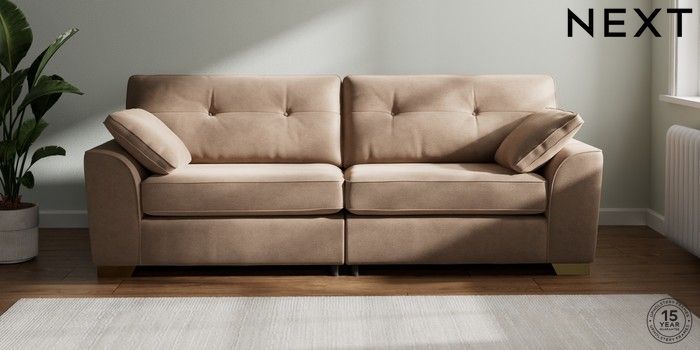 7.2.6 Buy Stamford Buttoned Back 4 Seater Sofa Luxe Chenille Mid Natural Large Square Angle - Brushed Brass from the Next UK online shop Click here to use our accessible website
