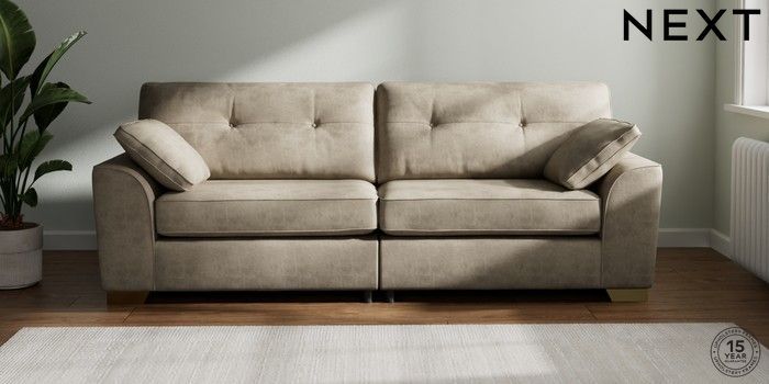 7.2.6 Buy Stamford Buttoned Back 4 Seater Sofa Monza Faux Leather Easy Clean Mink Brown Large Square Angle - Brushed Brass from the Next UK online shop Click here to use our accessible website