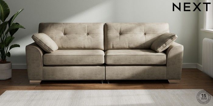 7.2.6 Buy Stamford Buttoned Back 4 Seater Sofa Monza Faux Leather Easy Clean Mink Brown Large Square Angle - Chrome Metal from the Next UK online shop Click here to use our accessible website