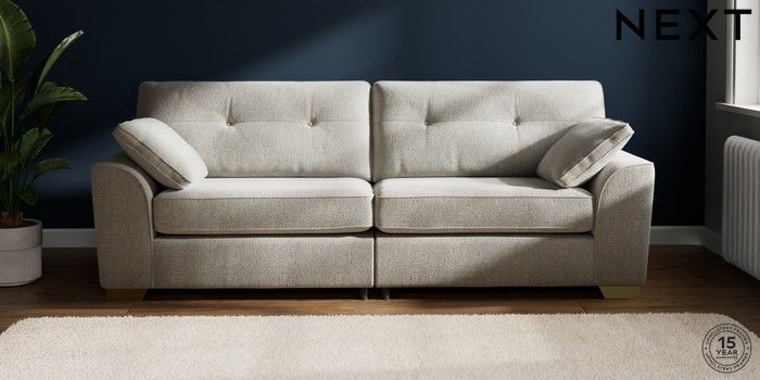 7.2.6 Buy Stamford Buttoned Back 4 Seater Sofa Multi Weave Light Blue Large Square Angle - Brushed Brass from the Next UK online shop Click here to use our accessible website