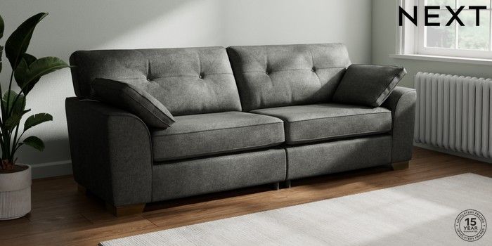 7.2.10 Buy Stamford Buttoned Back 4 Seater Sofa Plush Chenille Dark Grey Large Square Angle - Brushed Brass from the Next UK online shop Click here to use our accessible website