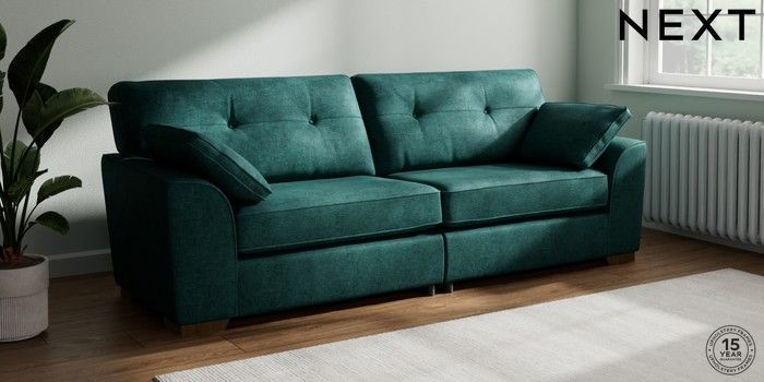 7.2.10 Buy Stamford Buttoned Back 4 Seater Sofa Plush Chenille Dark Teal Green Large Square Angle - Mid from the Next UK online shop Click here to use our accessible website