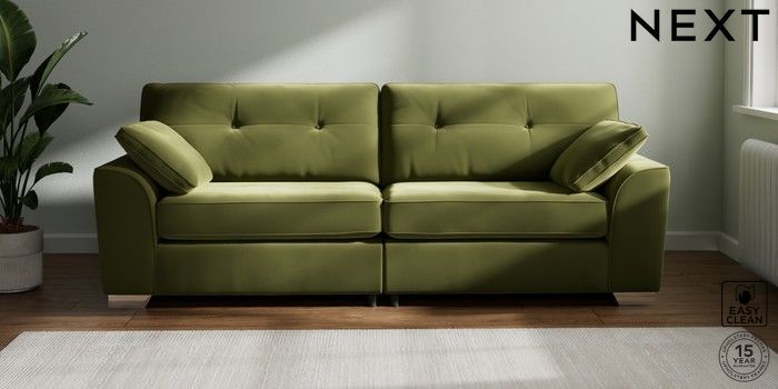 7.2.6 Buy Stamford Buttoned Back 4 Seater Sofa Plush Velvet Easy Clean Mid Olive Green Large Square Angle - Chrome Metal from the Next UK online shop Click here to use our accessible website
