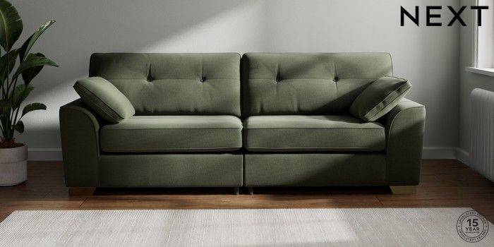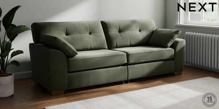 7.2.10 Buy Stamford Buttoned Back 4 Seater Sofa Relaxed Linen Look Dark Green Large Square Angle - Brushed Brass from the Next UK online shop Click here to use our accessible website
