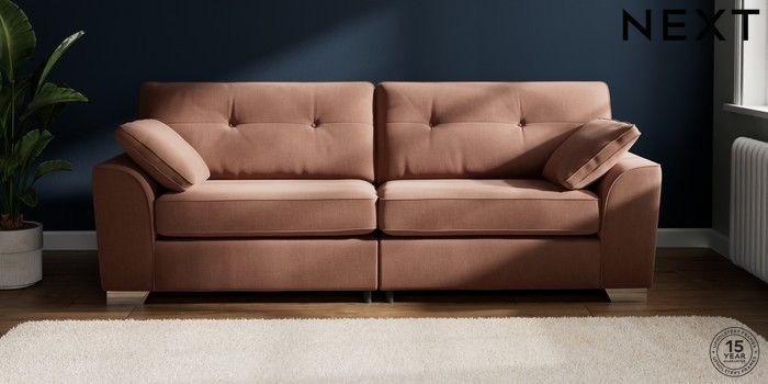 7.2.10 Buy Stamford Buttoned Back 4 Seater Sofa Relaxed Linen Look Light Rust Brown Large Square Angle - Chrome Metal from the Next UK online shop Click here to use our accessible website