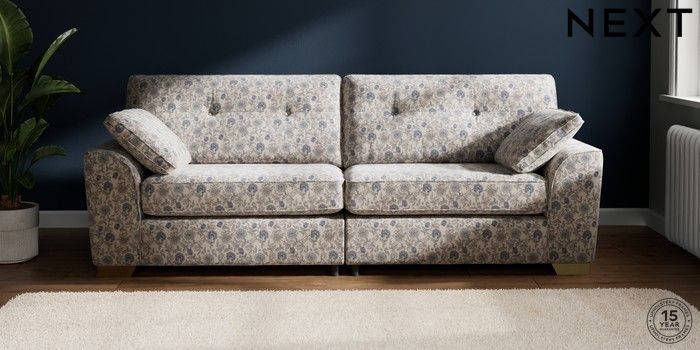 7.3.1 Buy Stamford Buttoned Back 4 Seater Sofa Relaxed Linen Look Print Woodblock Floral Blue Large Square Angle - Brushed Brass from the Next UK online shop Click here to use our accessible website