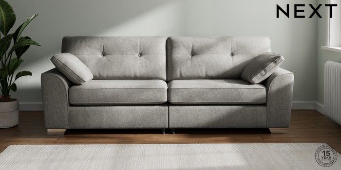 6.12.13 Buy Stamford Buttoned Back 4 Seater Sofa Tweedy Chenille Mid Grey Large Square Angle - Chrome Metal from the Next UK online shop Click here to use our accessible website