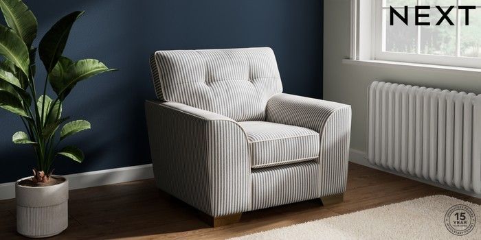7.3.1 Buy Stamford Buttoned Back Armchair Chenille Stripe Slate Blue Square Angle - Brushed Brass from the Next UK online shop Click here to use our accessible website