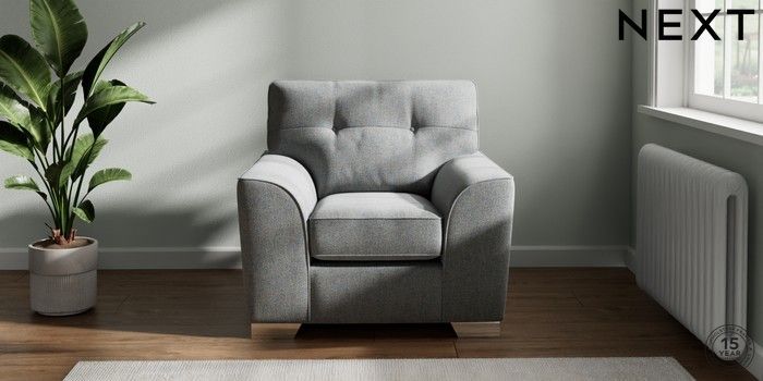 7.2.6 Buy Stamford Buttoned Back Armchair Chunky Marl Mid Grey Square Angle - Chrome Metal from the Next UK online shop Click here to use our accessible website