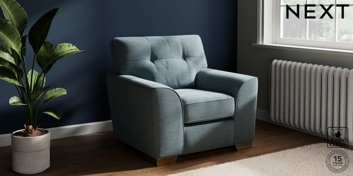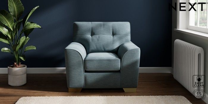 7.2.10 Buy Stamford Buttoned Back Armchair Fine Chenille Easy Clean Mid Blue Square Angle - Brushed Brass from the Next UK online shop Click here to use our accessible website