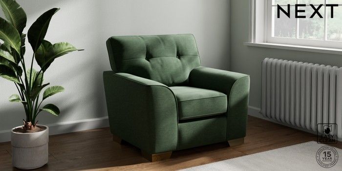 7.2.10 Buy Stamford Buttoned Back Armchair Fine Chenille Easy Clean Mid Khaki Green Square Angle - Brushed Brass from the Next UK online shop Click here to use our accessible website