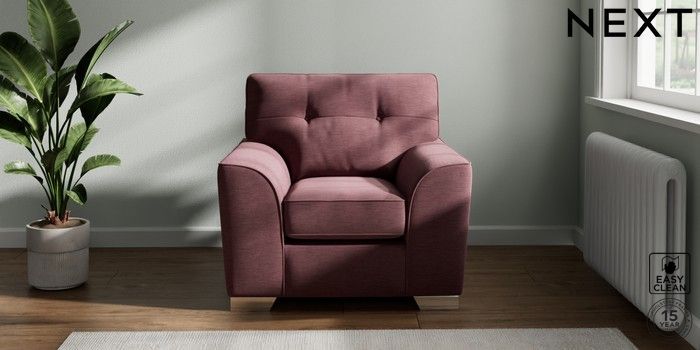 7.3.1 Buy Stamford Buttoned Back Armchair Fine Chenille Easy Clean Mid Mulberry Purple Square Angle - Chrome Metal from the Next UK online shop Click here to use our accessible website