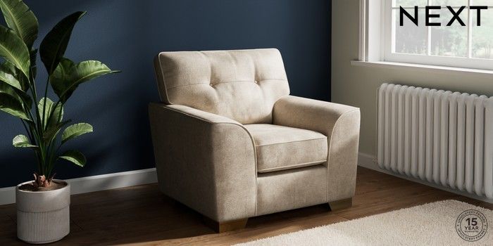 7.2.10 Buy Stamford Buttoned Back Armchair Plush Chenille Light Natural Square Angle - Brushed Brass from the Next UK online shop Click here to use our accessible website