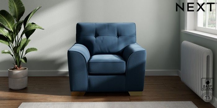 7.2.10 Buy Stamford Buttoned Back Armchair Plush Velvet Easy Clean Airforce Blue Square Angle - Brushed Brass from the Next UK online shop Click here to use our accessible website