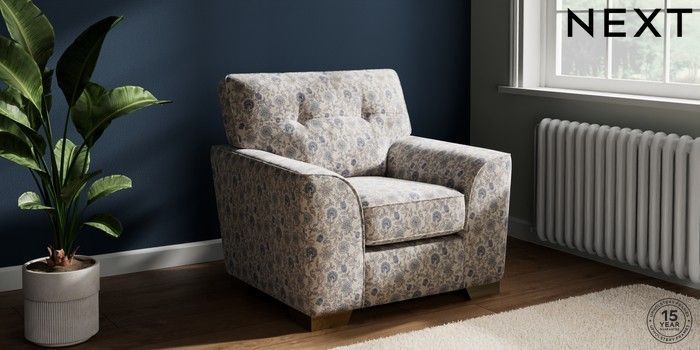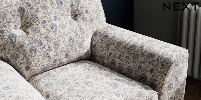 7.3.1 Buy Stamford Buttoned Back Armchair Relaxed Linen Look Print Woodblock Floral Blue Square Angle - Brushed Brass from the Next UK online shop Click here to use our accessible website