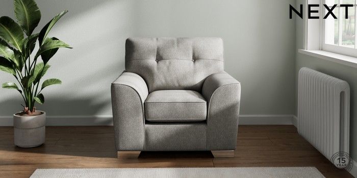7.2.6 Buy Stamford Buttoned Back Armchair Tweedy Chenille Mid Grey Square Angle - Chrome Metal from the Next UK online shop Click here to use our accessible website