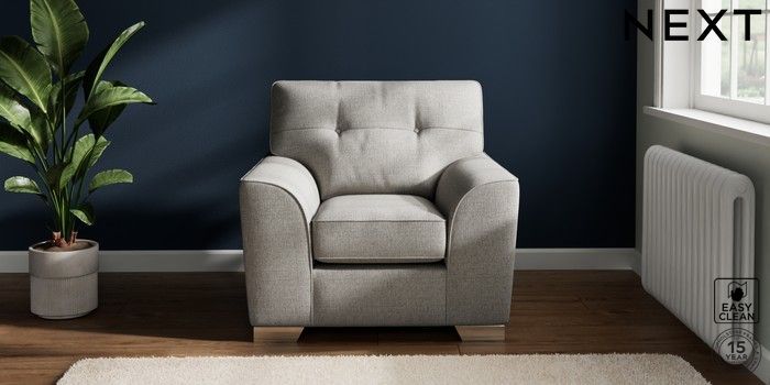7.2.6 Buy Stamford Buttoned Back Armchair Woven Chenille Easy Clean Light Grey Square Angle - Chrome Metal from the Next UK online shop Click here to use our accessible website