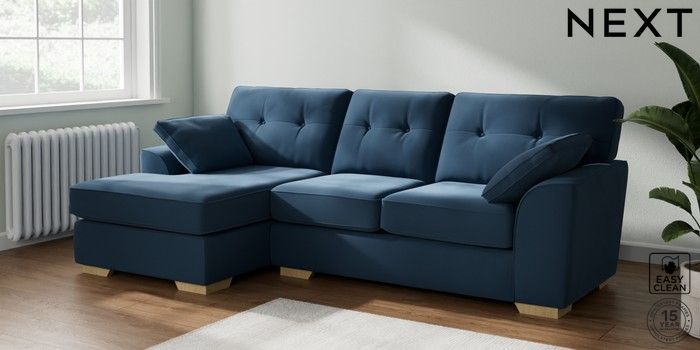 7.2.6 Buy Stamford Buttoned Back Medium Sofa Chaise - Left Hand Plush Velvet Easy Clean Airforce Blue Large Square Angle - Light from the Next UK online shop Click here to use our accessible website