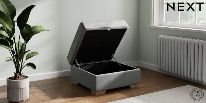 7.2.6 Buy Stamford Buttoned Back Storage Footstool Chunky Weave Mid Grey Square Angle - Light from the Next UK online shop Click here to use our accessible website