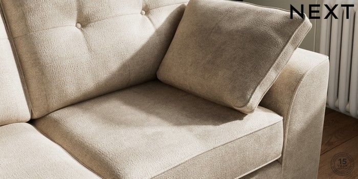 7.2.6 Buy Stamford Buttoned Back 2 Seater Sofa Plush Chenille Light Natural Large Square Angle - Brushed Brass from the Next UK online shop Click here to use our accessible website