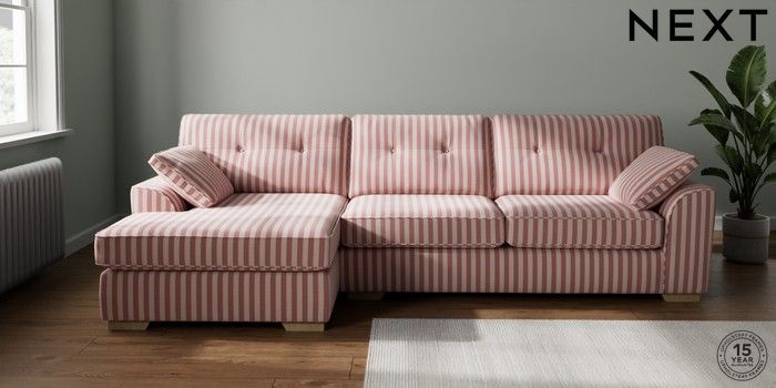 7.3.1 Buy Stamford Buttoned Back Large Sofa Chaise - Left Hand Bold Chenille Stripe Dark Pink Large Square Angle - Light from the Next UK online shop Click here to use our accessible website