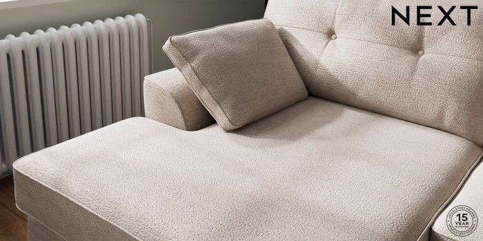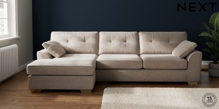 7.2.10 Buy Stamford Buttoned Back Large Sofa Chaise - Left Hand Boucle Chenille Light Natural Large Square Angle - Brushed Brass from the Next UK online shop Click here to use our accessible website