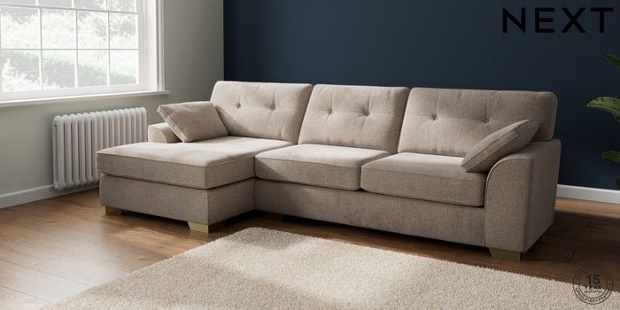 6.12.1 Buy Stamford Buttoned Back Large Sofa Chaise - Left Hand Chunky Chenille Light Dove Large Square Angle - Brushed Brass from the Next UK online shop Click here to use our accessible website
