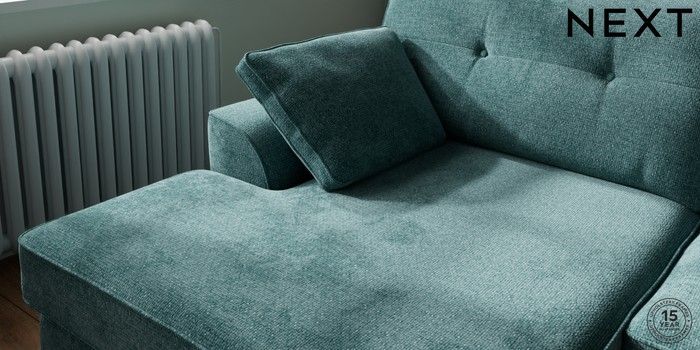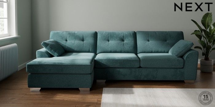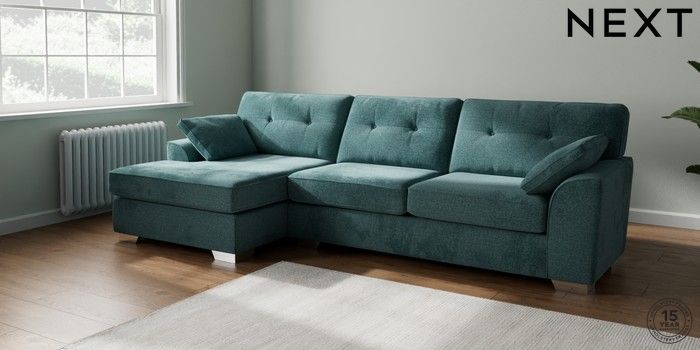 7.2.10 Buy Stamford Buttoned Back Large Sofa Chaise - Left Hand Chunky Chenille Mid Teal Green Large Square Angle - Chrome Metal from the Next UK online shop Click here to use our accessible website