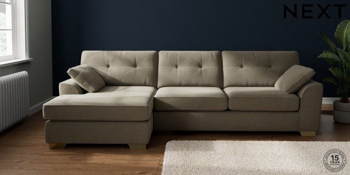 7.2.10 Buy Stamford Buttoned Back Large Sofa Chaise - Left Hand Chunky Marl Light Olive Green Large Square Angle - Brushed Brass from the Next UK online shop Click here to use our accessible website