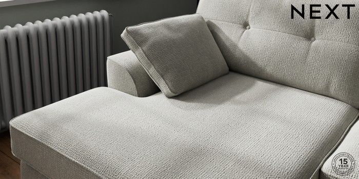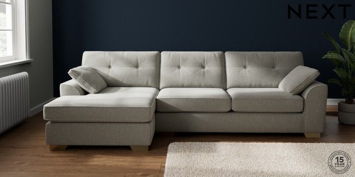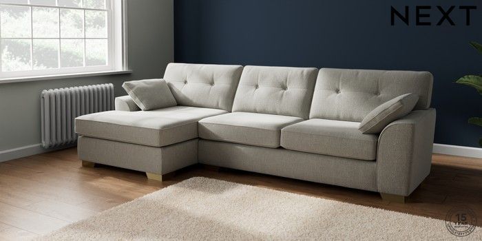 7.2.10 Buy Stamford Buttoned Back Large Sofa Chaise - Left Hand Chunky Texture Dove Large Square Angle - Brushed Brass from the Next UK online shop Click here to use our accessible website