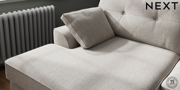 7.2.10 Buy Stamford Buttoned Back Large Sofa Chaise - Left Hand Chunky Weave Dove Grey Large Square Angle - Brushed Brass from the Next UK online shop Click here to use our accessible website