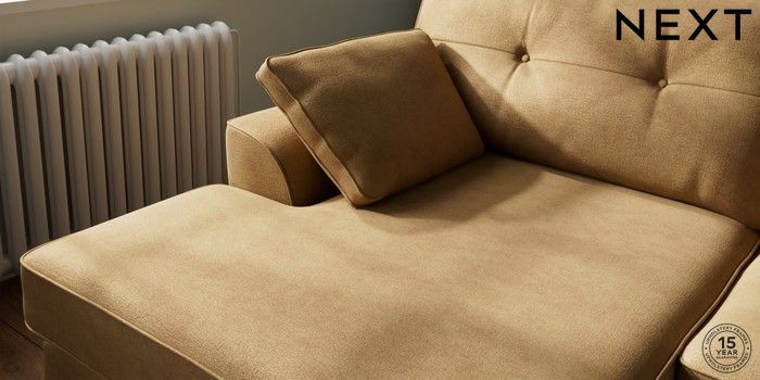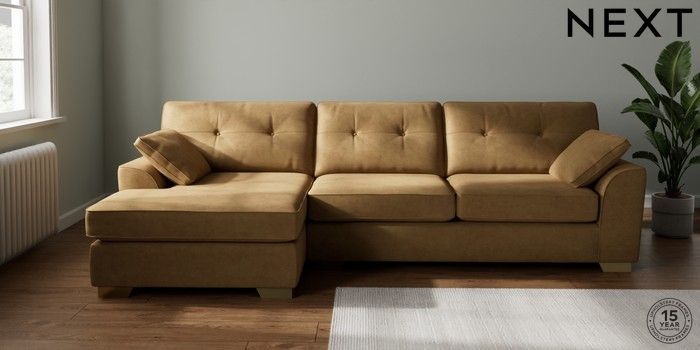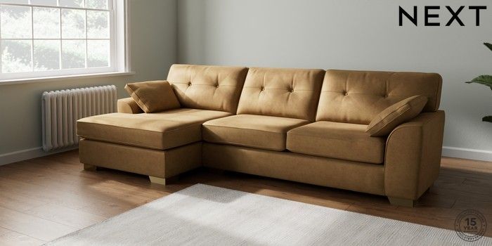 7.2.6 Buy Stamford Buttoned Back Large Sofa Chaise - Left Hand Luxe Chenille Honey Yellow Large Square Angle - Brushed Brass from the Next UK online shop Click here to use our accessible website