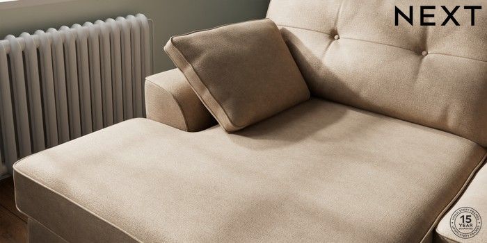 7.2.10 Buy Stamford Buttoned Back Large Sofa Chaise - Left Hand Luxe Chenille Mid Camel Beige Large Square Angle - Brushed Brass from the Next UK online shop Click here to use our accessible website