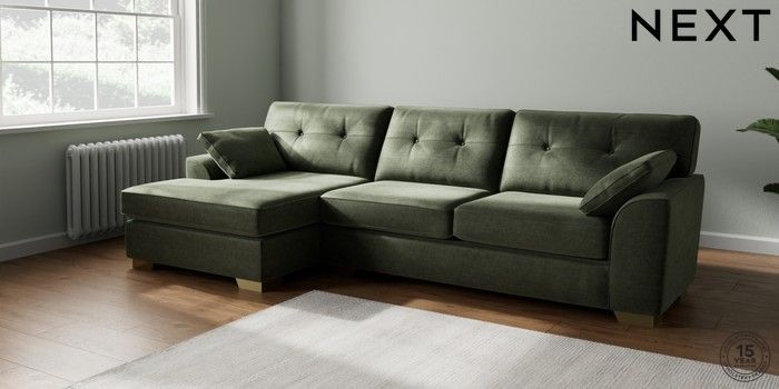 6.12.1 Buy Stamford Buttoned Back Large Sofa Chaise - Left Hand Luxe Chenille Mid Green Large Square Angle - Brushed Brass from the Next UK online shop Click here to use our accessible website