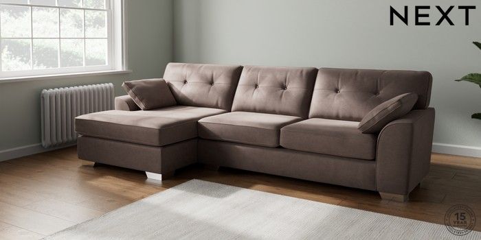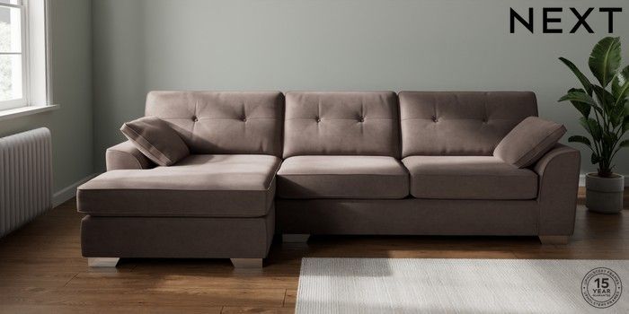 7.2.10 Buy Stamford Buttoned Back Large Sofa Chaise - Left Hand Luxe Chenille Mink Brown Large Square Angle - Chrome Metal from the Next UK online shop Click here to use our accessible website