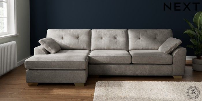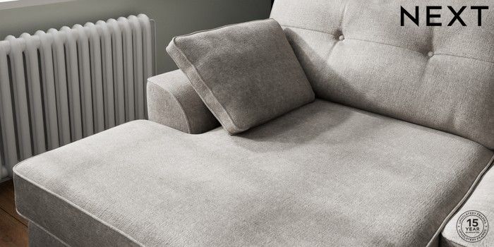 7.2.6 Buy Stamford Buttoned Back Large Sofa Chaise - Left Hand Plush Chenille Light Grey Large Square Angle - Brushed Brass from the Next UK online shop Click here to use our accessible website