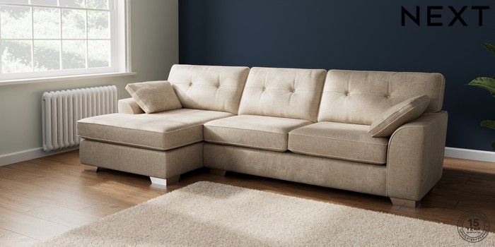 6.12.1 Buy Stamford Buttoned Back Large Sofa Chaise - Left Hand Plush Chenille Light Natural Large Square Angle - Chrome Metal from the Next UK online shop Click here to use our accessible website