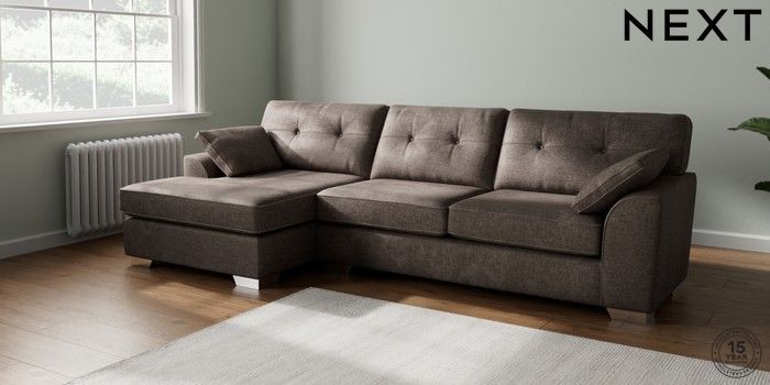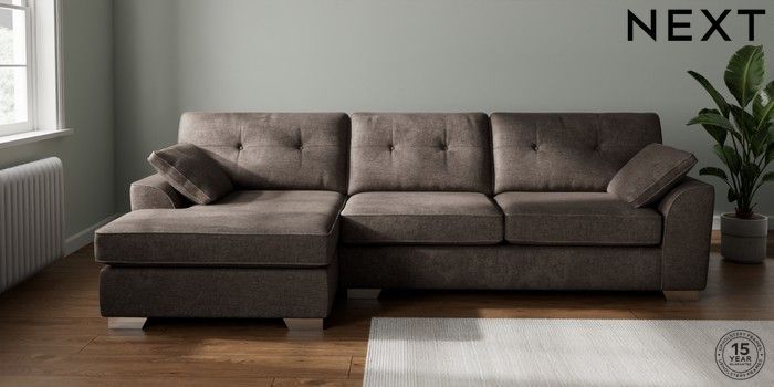 7.2.10 Buy Stamford Buttoned Back Large Sofa Chaise - Left Hand Plush Chenille Mink Brown Large Square Angle - Chrome Metal from the Next UK online shop Click here to use our accessible website